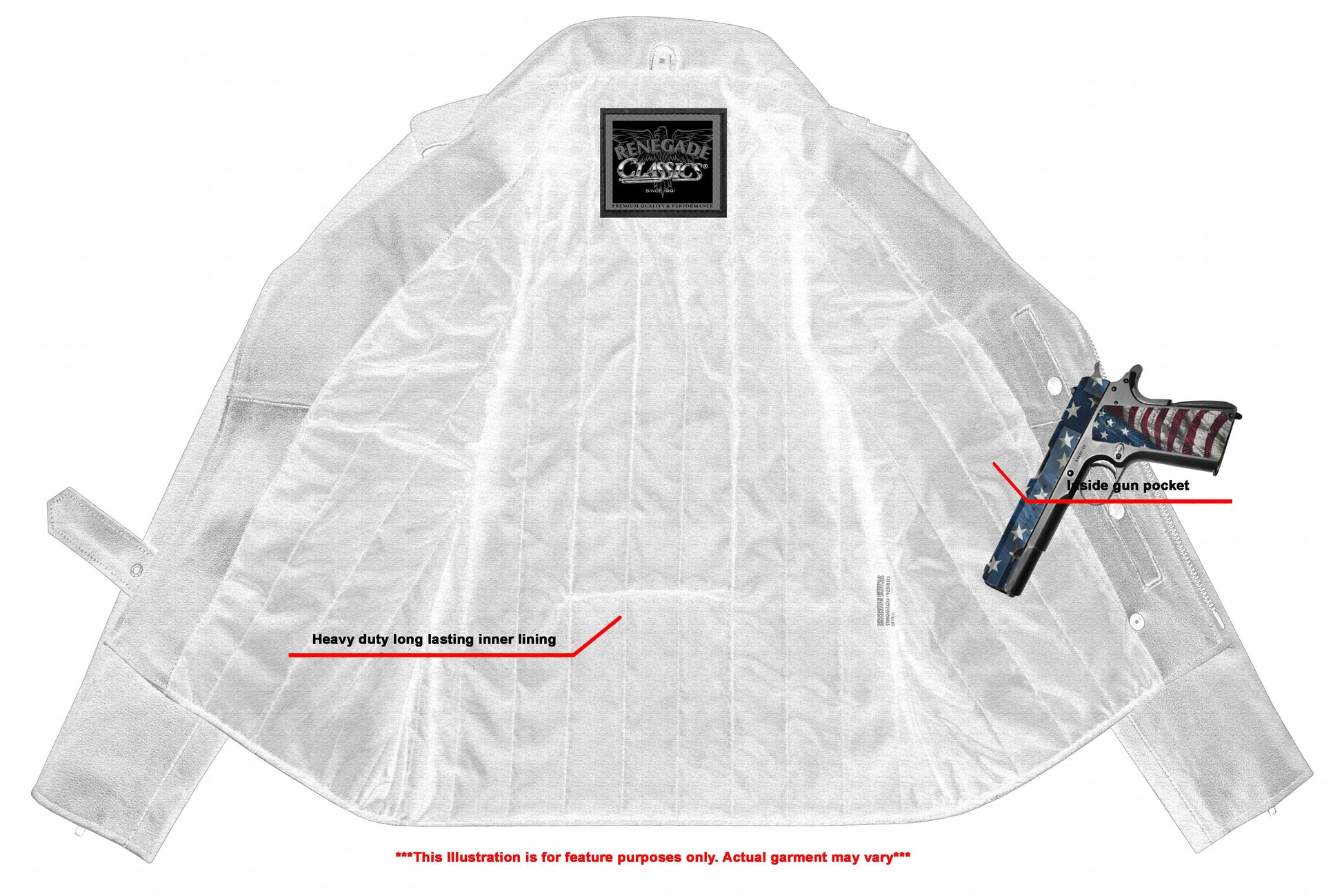 - 1 inside left-hand side concealed gun pocket made of special heavy-duty textile with built-in holsters and snap closure and 1 regular inside pocket.