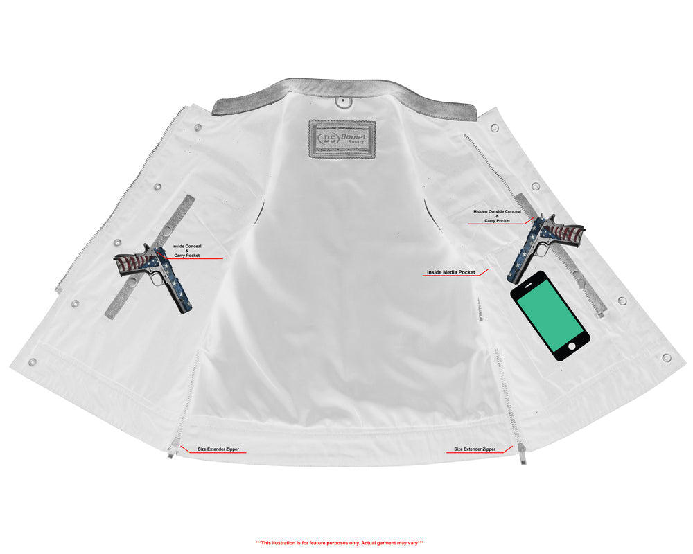 2 upgraded style concealed gun pockets between the snap and the zipper made of special heavy-duty textile with built-in holsters and snap closure.