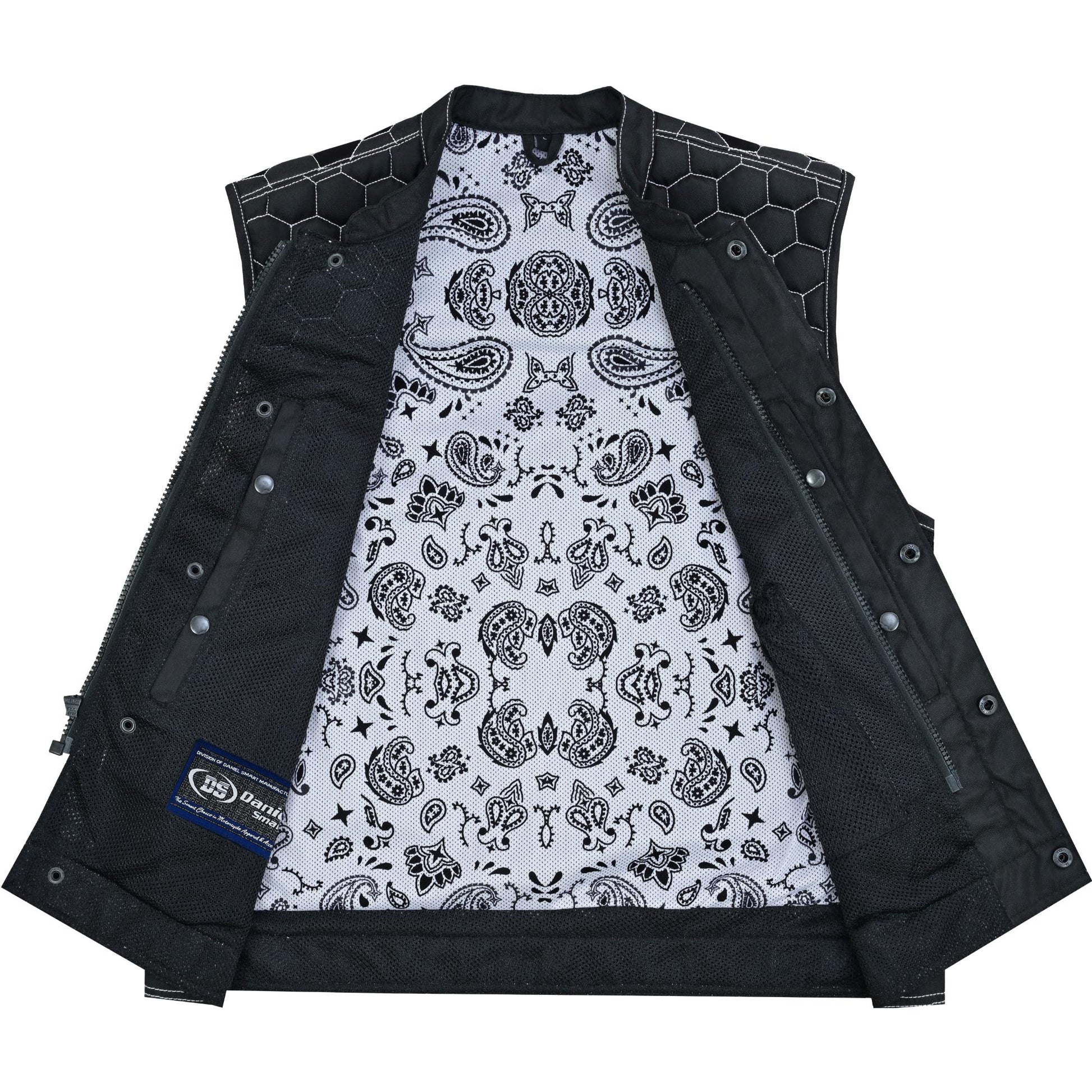 Our Dark Striker Black Mesh Textile Vest features a durable mesh construction with vibrant black accents. It includes concealed carry and secure chest pockets with snap button closures for convenience. The hidden front zipper with snap-placket reinforced stitching and built-in hanging loop adds to its practicality and style. This vest is perfect for those who want a striking, functional Vest to match their riding styles.